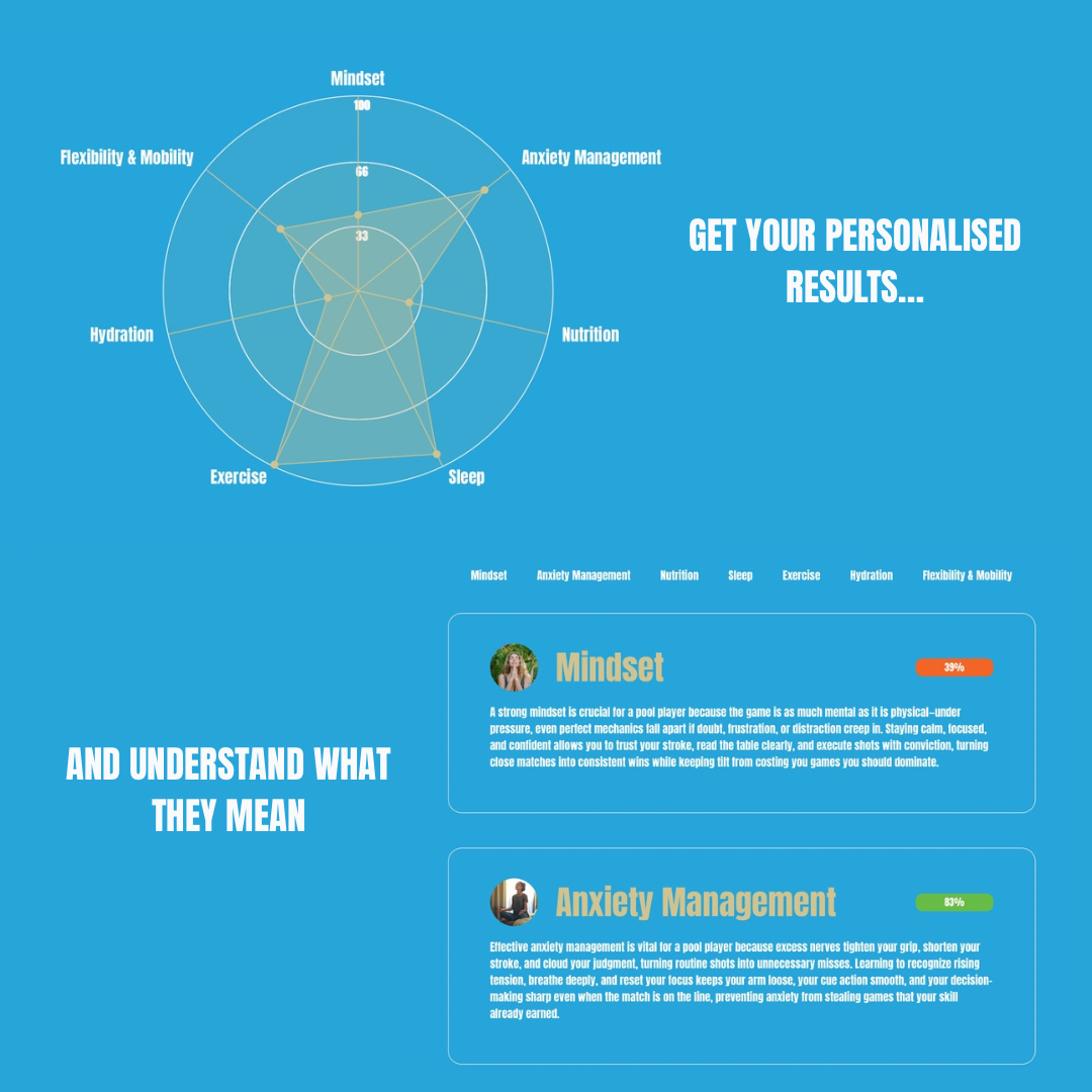 The work you do off the table is the foundation for everything — energy, focus, and quality of performance. The Performance Wheel helps you assess 7 essential areas of performance, from physical fitness to mindset and lifestyle habits. In less than 5 minutes, you’ll pinpoint your strengths and the areas needing the most attention, empowering you to take proactive steps toward becoming a better, more optimised pool player.